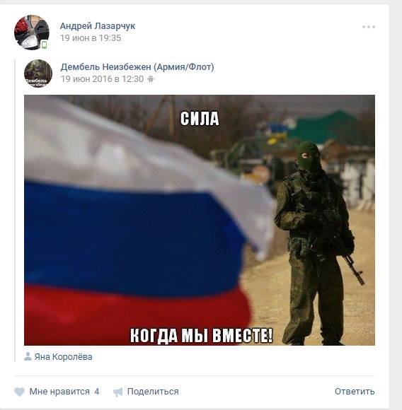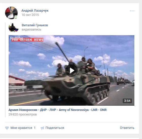 По предоставленной информации со страницы Лазарчука в соцсетях, этот украинский военный увлечен деятельностью пророссийских террористов на Донбассе и интересуется заявлениями президента РФ Владимира Путина.