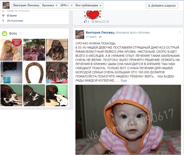 Пользователь Facebook Инна Голоктионова пишет, что  "нашей девочке поставили страшный диагноз острый лемфобластный лейкоз (рак крови)".Нажиться на чужом горе