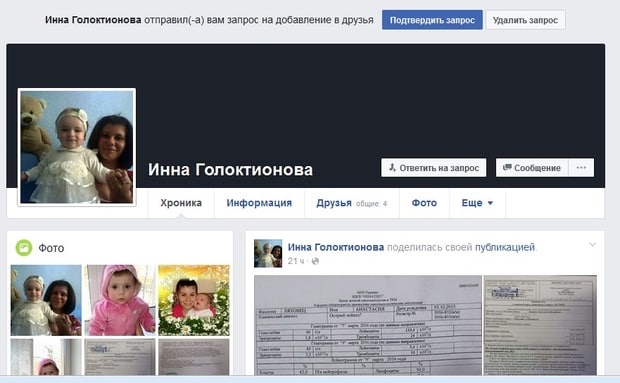Реальный профиль матери больной девочки
