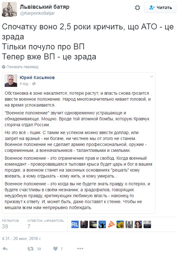 «Военное положение - это когда вы не будете знать правду о потерях, и будете счастливы в своём незнании; а зрадофилов, говорящих неудобную правду, критикующих любимую власть - наконец-то призовут к ответу. И, может быть, даже поставят к стенке. Чтобы не мешали всем нам непрерывно побеждать», - утверждает волонтер.