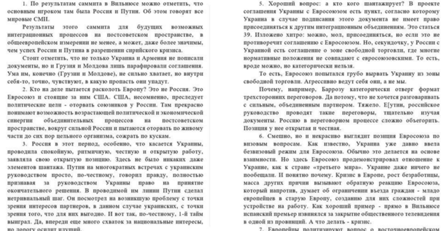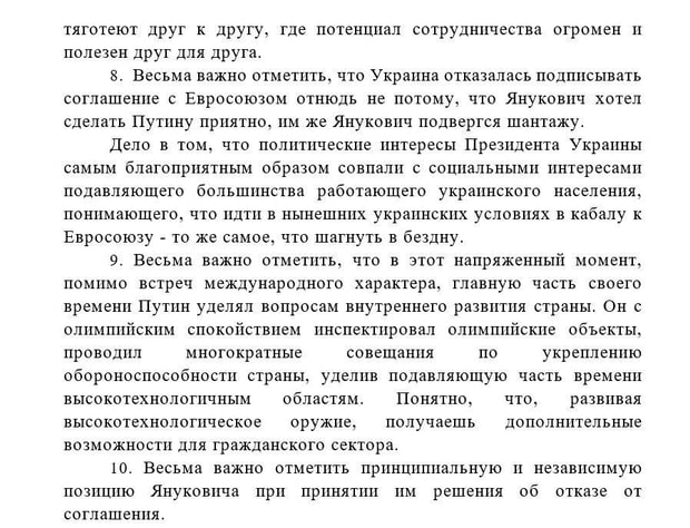 "Весьма важно отметить, что Украина отказалась подписывать соглашение с Евросоюзом отнюдь не потому, что Янукович хотел сделать Путину приятно… политические интересы президента Украины самым благоприятным образом совпали с социальными интересами подавляющего большинства работающего украинского населения. Понимающего, что идти в нынешних украинских условиях в кабалу к Евросоюзу – то же самое, что шагнуть в бездну", - говорится в представленном тексте.