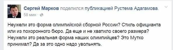 "Невже це форма олімпійської збірної Росії: стиль офіціанта або з похоронного бюро. Та ще й не вистачило свого розміру? Невже це реальна форма наших олімпійців? Це Мутко брав? Так за це одне треба звільняти", - пише на свій сторінці у Facebook Сергій Марков.