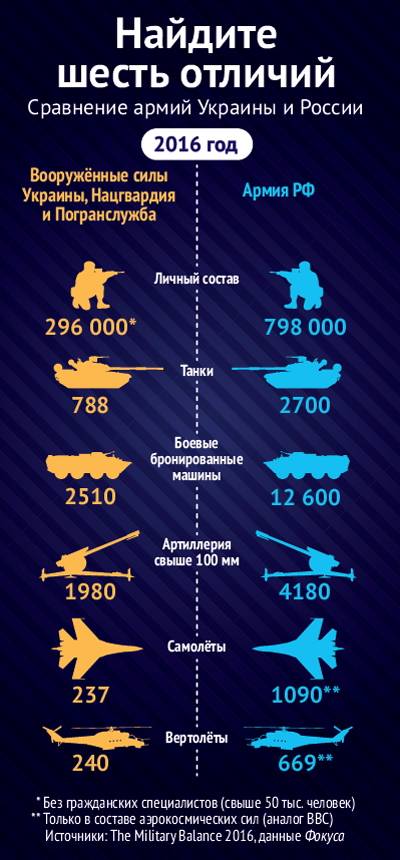 Резко усилились военно-воздушные силы «украинского кольца»: количество российских боевых самолётов увеличилось в полтора раза — с 375 до 560 машин; а боевых вертолётов в 4 раза — со 100 до 400 машин. К этой армии стоит добавить 34 боевых корабля Черноморского флота РФ, базирующихся в Крыму. За год крымская флотилия РФ пополнилась фрегатом «Адмирал Григорович», двумя малыми ракетными кораблями и двумя современными подлодками.