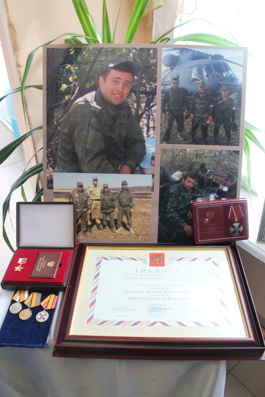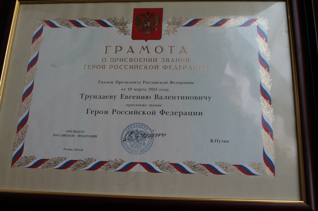 Грамота о присвоении звания Герой Российской Федерации Трундаеву Евгению Валентиновичу, подписанная Президентом России согласно указа от 19 марта 2015 года (вероятно это секретный указ №145с от 19.03.2015, по которому награждались ивоеннослужащие других войсковых частей в частности 51-го парашютно-десантного полка 106-й воздушно-десантной дивизии):