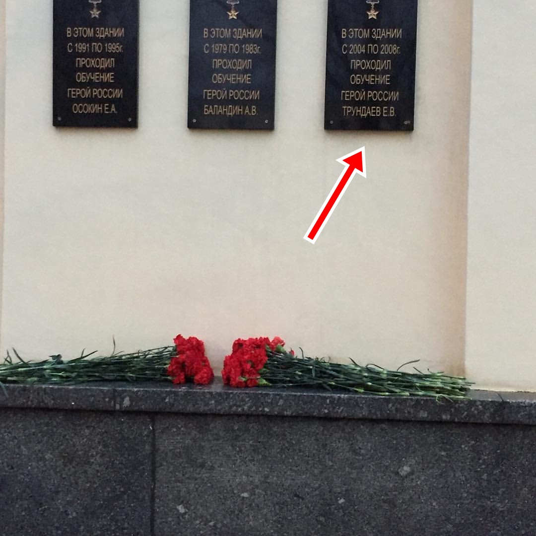 Так курсант Московского высшего военного командного училища на своей странице "ВКонтакте" аккаунта Игорь Суворов разместил фото мемориальных табличек с именами выпускников этого училища, которые стали Героями России. Крайняя правая табличка - Евгения Трундаева. Комментарий под фотографией: "Трундаев Евгений, выпускник нашего училища, погиб 15 октября под Донецком".