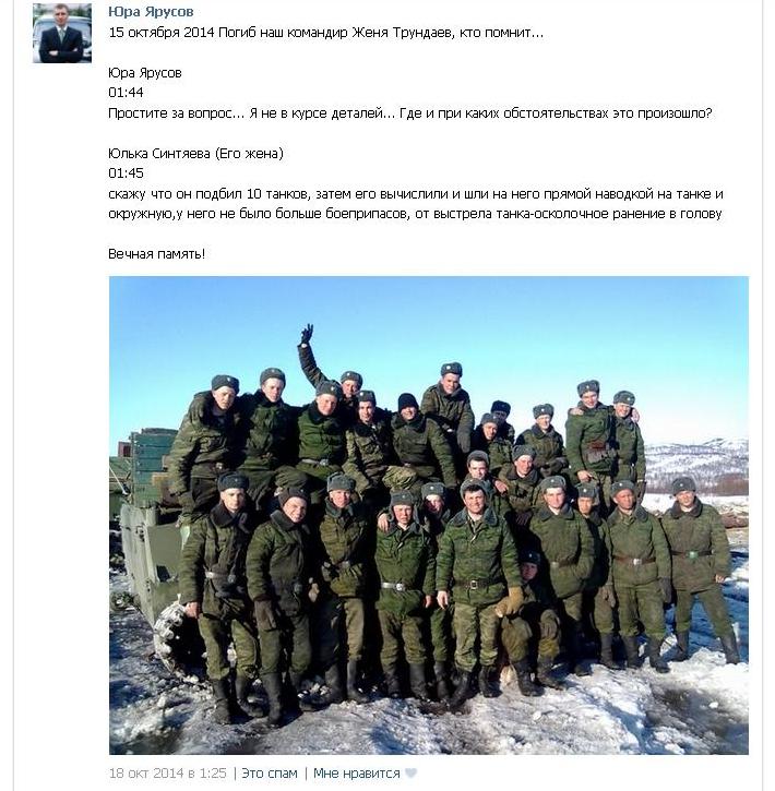 19 октября уже в сообществе "Противо танковый взвод" 200-й мотострелковой бригады ещё один бывший сослуживец Трундаева АнтонИвлев делает запись со словами "Мужики 15 октября 2014г погиб наш командир Евгений Трундаев! вечная память!"