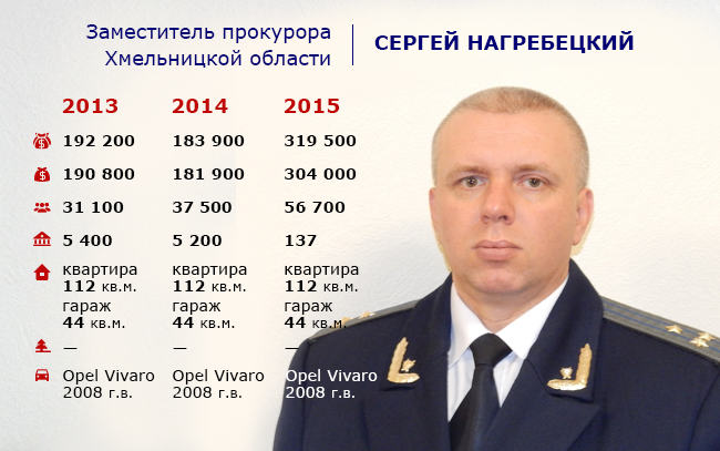 Карьера заместителя облпрокурора Сергея Нагребецкого также с самого начала была связана с Хмельницкой областью. Уроженец РФ, окончив Львовский университет, он работал сначала следователем районной прокуратуры, потом занимал разные должности в областной прокуратуре, возглавлял районные прокуратуры, некоторое время трудился в стенах ГПУ. На свою нынешнюю должность был назначен в декабре 2014 года.