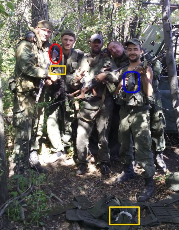 Фотография военнослужащих 200-й бригады с большим количеством опознавательных знаков, характерных для боевиков на Донбассе.