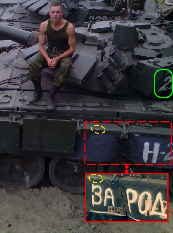 Данный танк после возвращения в постоянное место дислокации. Вновь нанесены белой краской старые двухсотые номера, надпись "ЗА РОДИНУ!" стерта, но не полностью: