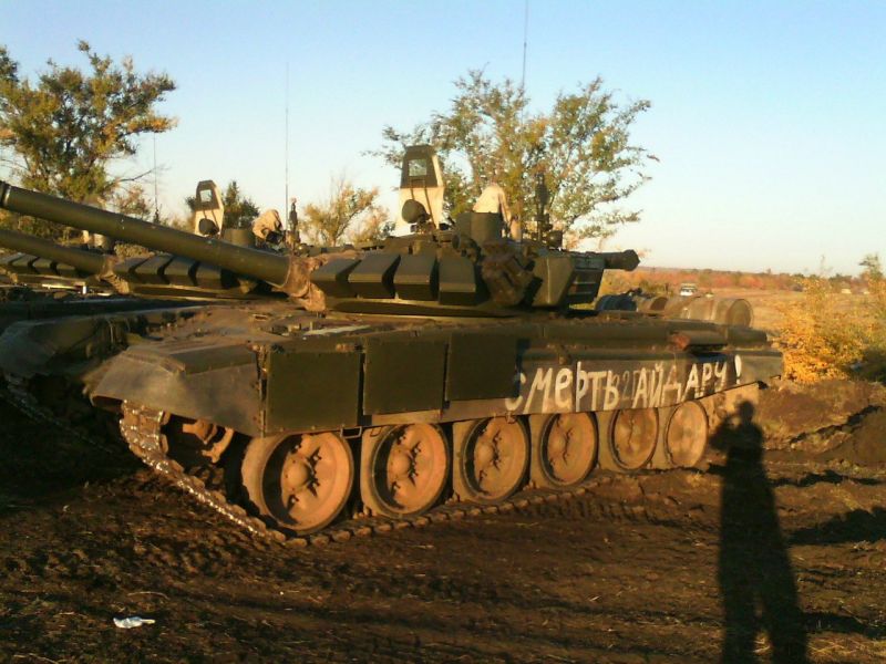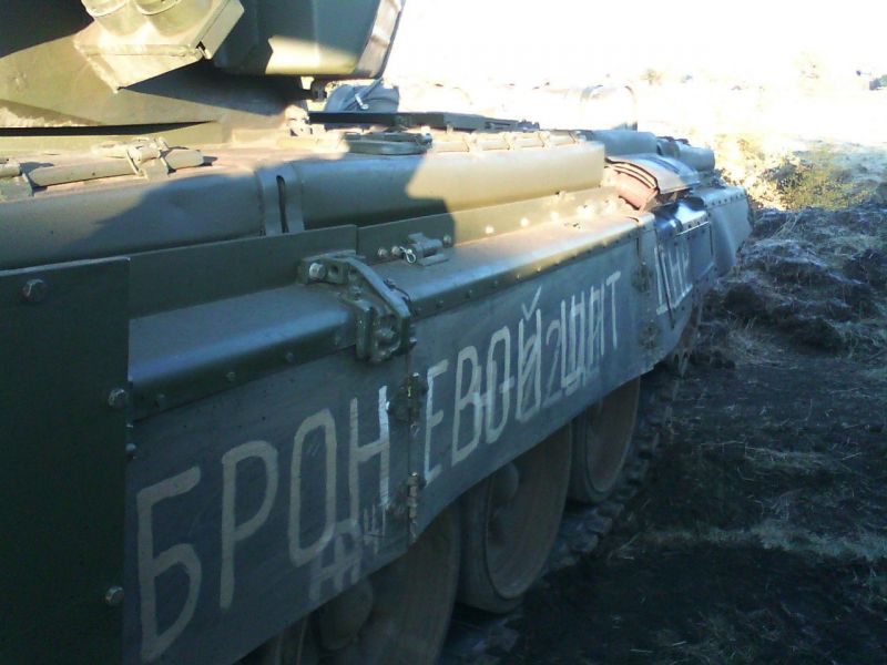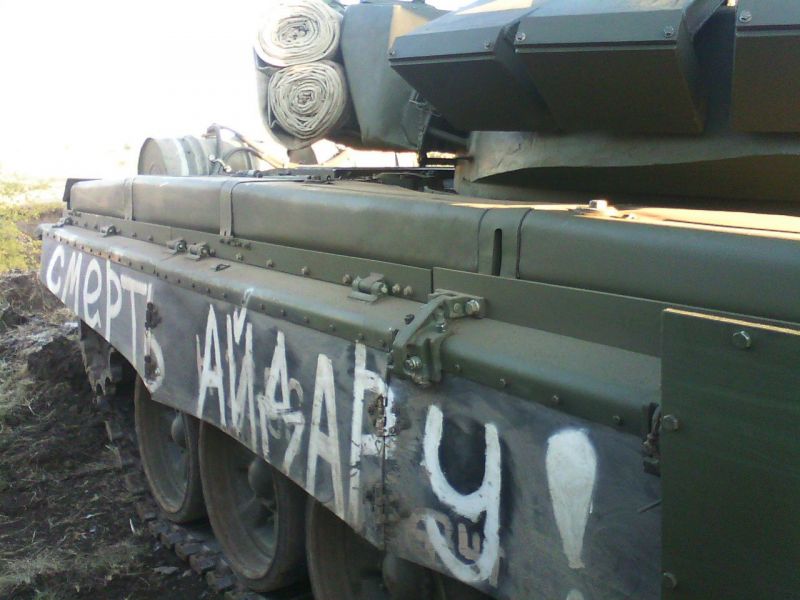 Танк Т-72Б3 без номера с надписью "СМЕРТЬ АЙДАРУ!" на бортовых экранах корпуса с двух сторон.