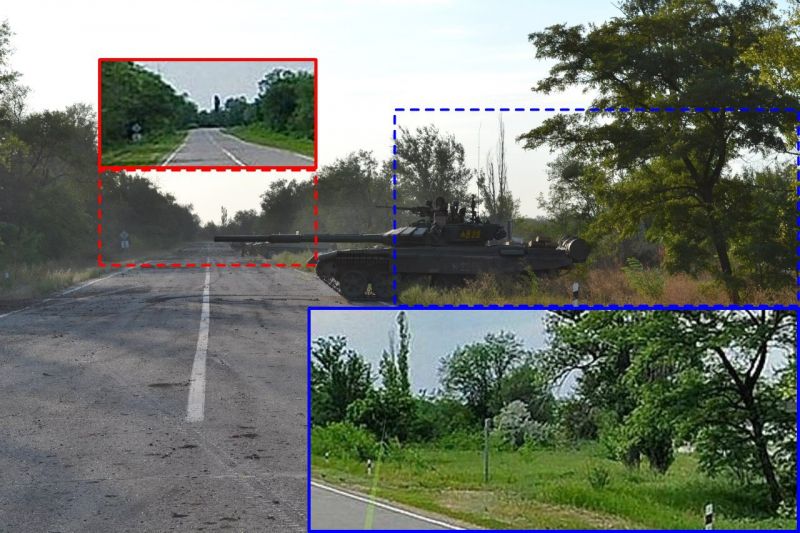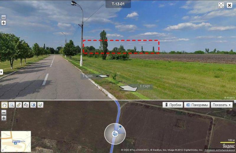 С помощью службы "Яндекс.Панорамы" удалось установить, что танк Т-72Б3 с желтым бортовым номером 828 и опознавательным треугольником 200-й ОМСБр, а также бронетехника за ним, сняты на дороге в 600 метрах от бывшего терминала луганского аэропорта.