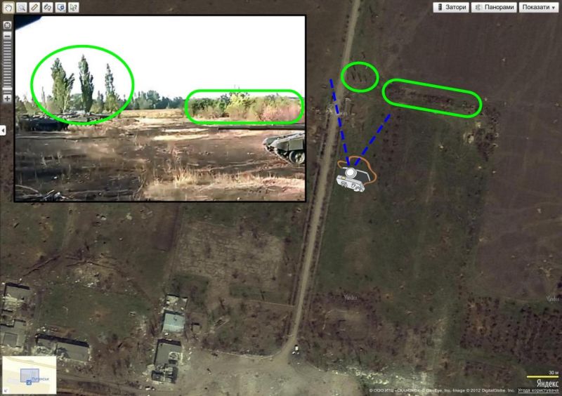 Те же деревья видны на видео 200-й бригады, сделанном в аэропорту Луганска. Координаты: 48 ° 25’27.3 "N 39 ° 22’48.8" E.