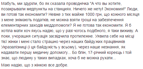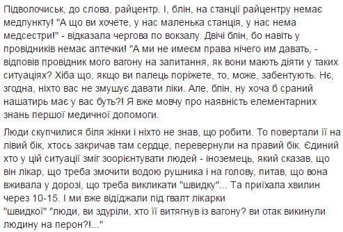 "В соседнем вагоне кому-то стало плохо. Я стояла в тамбуре и стала свидетелем. Потеряла сознание женщина в военной форме. Еще на перроне в Тернополе я заметила, как много военных садились в соседний вагон. Среди них была и эта блондинка, лет 35+. Сейчас ее несли по коридору вагона, через тамбур, затем вытащили на перрон. Там ее положили на простыню и подушку. Лицо женщины отекло, покрылось красными пятнами, кто-то сказал, что у нее судорога и какой-то мужчина поднял ее ноги. Она не реагировала", – написала Василец.