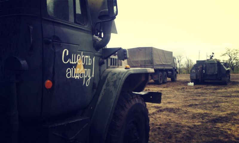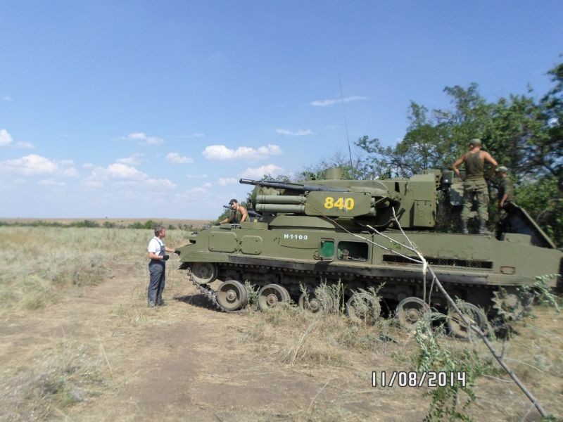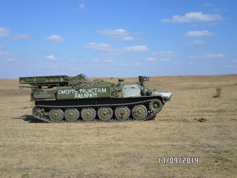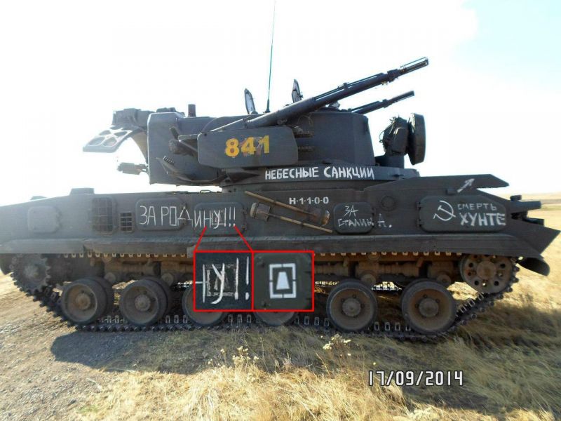 Фото зенитного комплекса "Стрела-10" с надписью "СМЕРТЬ ФАШИСТАМ АЙДАРА!!!" на правой стороне корпуса - это один из кадров работника военно-ремонтного завода Михаила Боюрова, опубликовавшего на своей странице "ВКонтакте" серию фотографий боевой техники 200-й ОМСБр периода осени 2014 года.