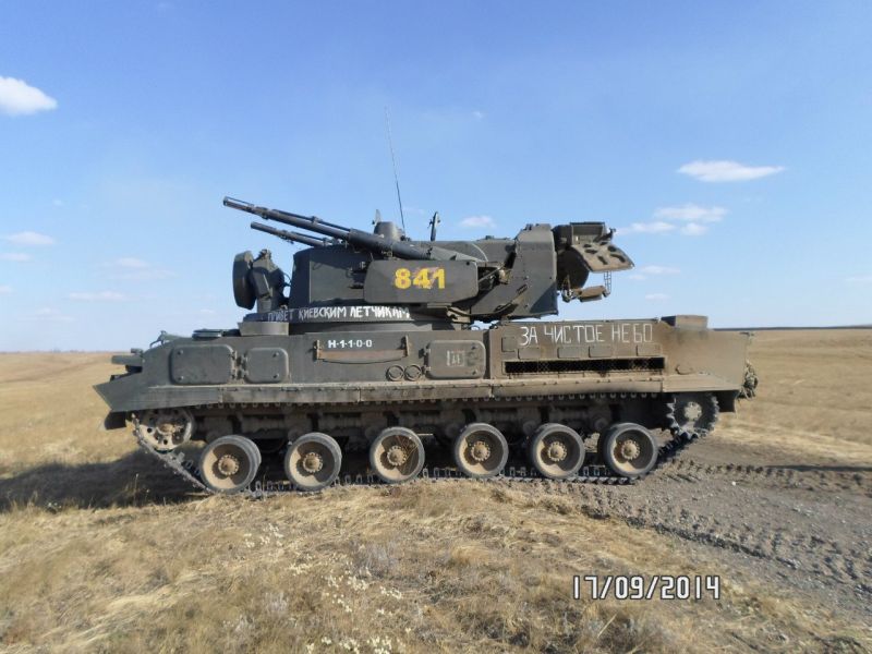 Зенитная самоходная установка 2С6 "Тунгуска" бортовой номер "841" - боевая машина 200-й ОМСБр ВС РФ, на которой нанесено самое большое количество надписей: с правой стороны "Небесные санкции", "За Родину !!!", "За Сталина", "Смерть хунте", с левой - "За чистое небо", "Привет киевским летчикам".