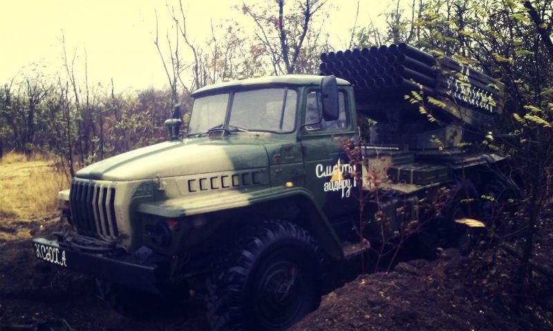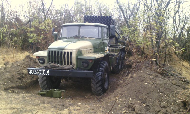 РСЗО БМ-21 "Град" с опознавательными желтыми треугольниками и надписями "Смерть айдару!" на дверях, а также "Ксюха" на переднем бампере, "ЗА СТАЛИНА" с левой стороны пусковой установки.
