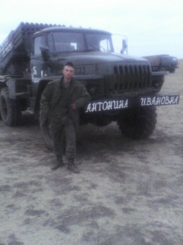 РСЗО БМ-21 "Град" с надписями "За Родину!" на правой двери и "Антонина Ивановна" на переднем бампере. Снимки от военнослужащих (на то время) 200-й бригады Анатолия Горшкова (архивы его страниц с рапортом на увольнение из реактивного артиллерийского дивизиона 200-й ОМСБр и фото с геометкой из Печенги - ниже) и Николая Дугаева.