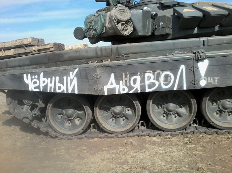 Танк Т-72Б3 с желтым треугольником и восьмисотым номером на динамической защите башни, надписью "Чёрный дьявол" на правом бортовом экране корпуса.