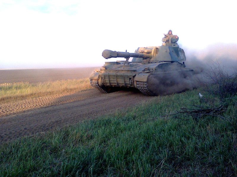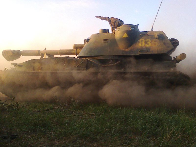 Фотографии самоходной артиллерийской установки 2С3 бортовой номер "834" с надписями: "Кулак Сталина" на стволе, "Не шуми, а то приеду" с правой стороны башни, "Смерть Фашизму" и опознавательным желтым треугольником на левой стороне башни.
