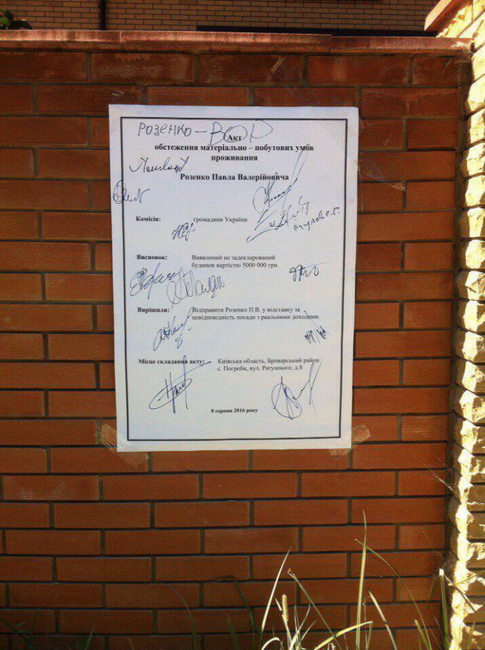 Після того як до учасників пікету ніхто не вийшов, вони повісили на паркан особняка плакат – умовний "Акт обстеження матеріально-побутових умов проживання" Павла Розенка, в якому оцінили будинок в 5 млн гривень, а самого Розенка назвали злодієм і зажадали відправити його у відставку "за невідповідність посади реальним доходам".