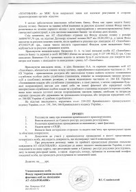 Учитывая вышеизложенные обстоятельства, в действиях Якименко Елены Анатольевны и отдельных должностных лиц Банка, есть признаки совершения преступления, предусмотренного соответствующей частью ст. 191 УК Украины – «присвоение, растрата или завладение чужим имуществом путем злоупотребления должностным лицом своим служебным положением, совершенное по предварительному сговору группой лиц в (особо) крупных размерах».