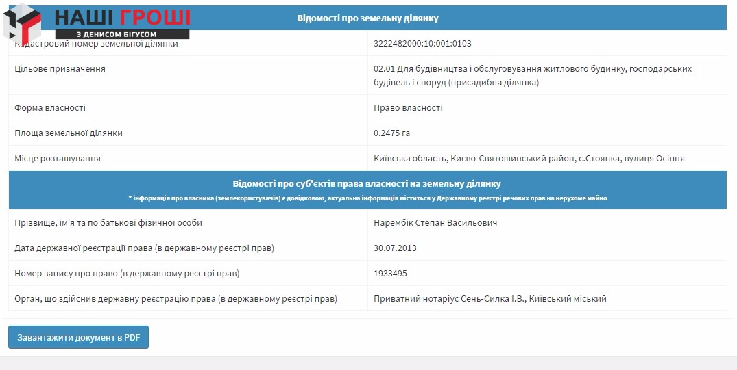 Раніше журналісти "Наших грошей з Денисом Бігусом", вже розповідали про іншого власника маєтків у Стоянці, Віктора Червоного. Екс-голова Державного комітету лісового господарства України також володіє там двома будинками, які розміщені на кількох ділянках загальною площею щонайменше 2,7 га: чотири ділянки землі на гектар оформлено на самого Віктора Червоного, ще дві ділянки на пів гектара – на дружину, а також мінімум по одному паю мають син і дочка.