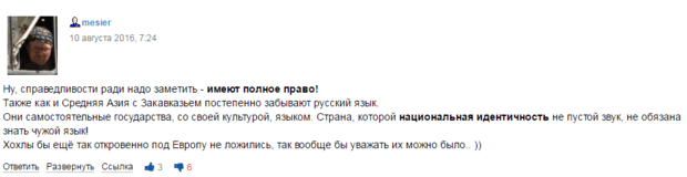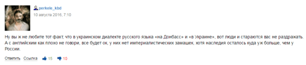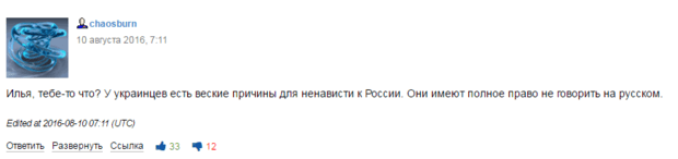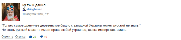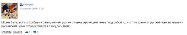 "Любой образованный украинец хорошо знает русский язык. Только самое дремучее деревенское быдло с западной Украины может русский не знать. Киев, Одесса и другие города всегда говорили по-русски. Так что в то, что украинцы вдруг начали забывать русский язык, я не верю. Это какой-то новый тренд? Или я просто так неудачно попал?" - подытожил обиженый россиянин.