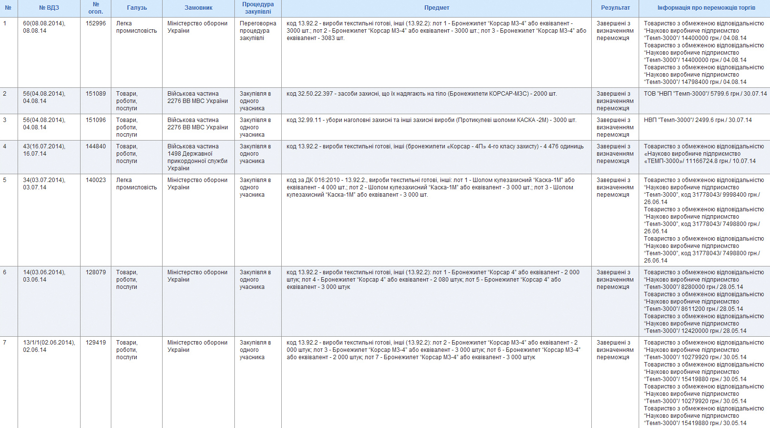 Минобороны и военная часть 2276 ВВ МВД – Нацгвардия – часто шли именно этим путем. В частности, сотрудничали с компанией “НПП” Темп-3000 “. Общая сумма закупок у нее за два месяца превышает 160 млн. грн. Неизвестно, чем эта компания так понравилась руководству Минобороны.