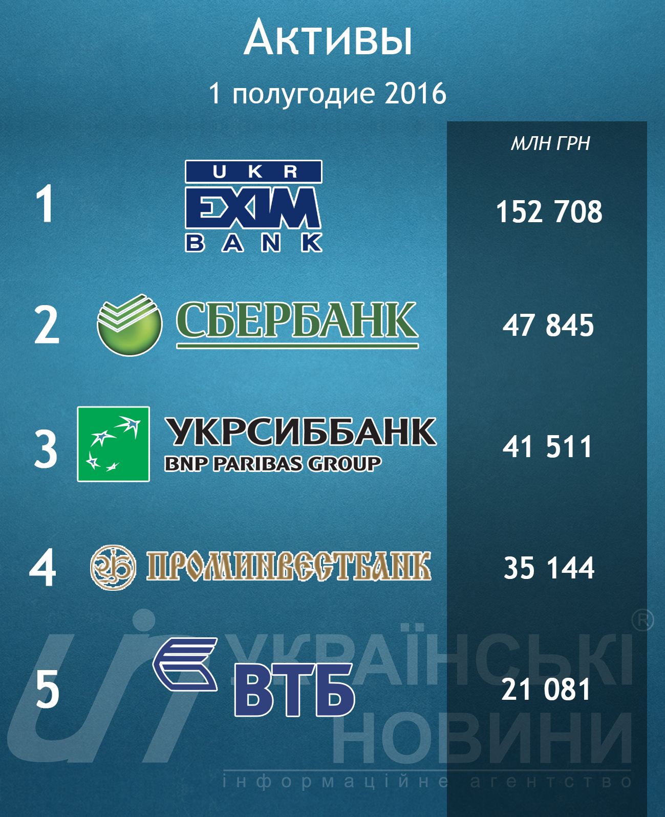 Четвертую позицию занял государственный Укрэксимбанк. В январе-июне Государственный экспортно-импортный банк сократил убыток в 4 раза до 1,325 млрд гривен, по сравнению с аналогичным периодом 2015 года (5,499 млрд гривен). Как и в случае со Сбербанком, так и с Укрэксимбанком, убытки были получены из-за формирования резервов. Отчисления в резервы банком в первом полугодии составили 2,449 млрд гривен. Процентные доходы за указанный период составили 7,219 млрд гривен, расходы – 5,578 млрд гривен. По размеру активов Укрэксимбанк занял третье место увеличив их на 8,1% до 152,7 млрд гривен. Кредитный портфель банка за указанный период вырос на 1,2% до 55,7 млрд гривен, средства клиентов – на 3,1% до 81,8 млрд гривен.