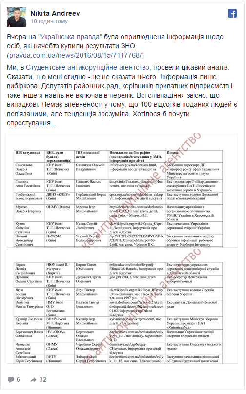 Активісти Студентського антикорупційного агентства з’ясували, чиї діти замішані у скандалі з фальсифікацією результатів Зовнішнього незалежного оцінювання. Про це на своїй сторінці у Facebook повідомив глава організації, член Нацагентства щодо забезпечення якості освіти, Микита Андрєєв", повідомляють "Українські реалії" з посиланням на Патріоти України.