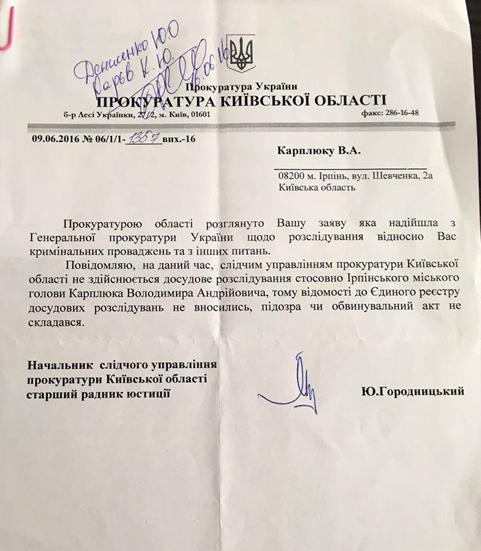 «Генпрокуратура расследует производство по ст. 364 УК Украины относительно злоупотребления должностными лицами Бучанского городского совета при выделении 890 га земли в городе Буча. Выделение земли состоялось в 2002 году. А я занимал должность заместителя по экономическим вопросам Бучанского городского головы с 19 ноября 2010 по 25 июля 2011 года, то есть, меньше года. В мои должностные обязанности не входили полномочия по распоряжению землями территориальной общины города Бучи. Генеральная прокуратура Украины предоставила ответ моему адвокату, которым констатировала отсутствие уголовных производств или объявления мне подозрений (письмо ГПУ от 03.08.2016 года за номером 04/2 / 3-1540-16). Несмотря на это я готов к диалогу с представителями всех правоохранительных органов и готов предоставить все необходимые показания, как только получу телефонное приглашение или официальное сообщение о вызове. Уверен, что я свою правоту докажу и следствию, и суду. Вместе с тем, убежден, что следователи Генпрокуратуры проведут честное и беспристрастное следствие». После этих слов Карплюк вручил 140 атошникам из Ирпеня и Приирпенья акты за земельные участки.