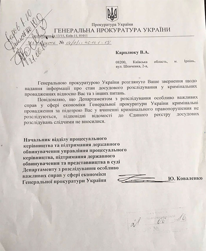В подтверждение своих слов, Карплюк продемонтрировал общественности ответы за запросы в ГПУ, которые он посылал еще в мае, когда началась активная кампания против него и появилось прозвище «Вова67»: