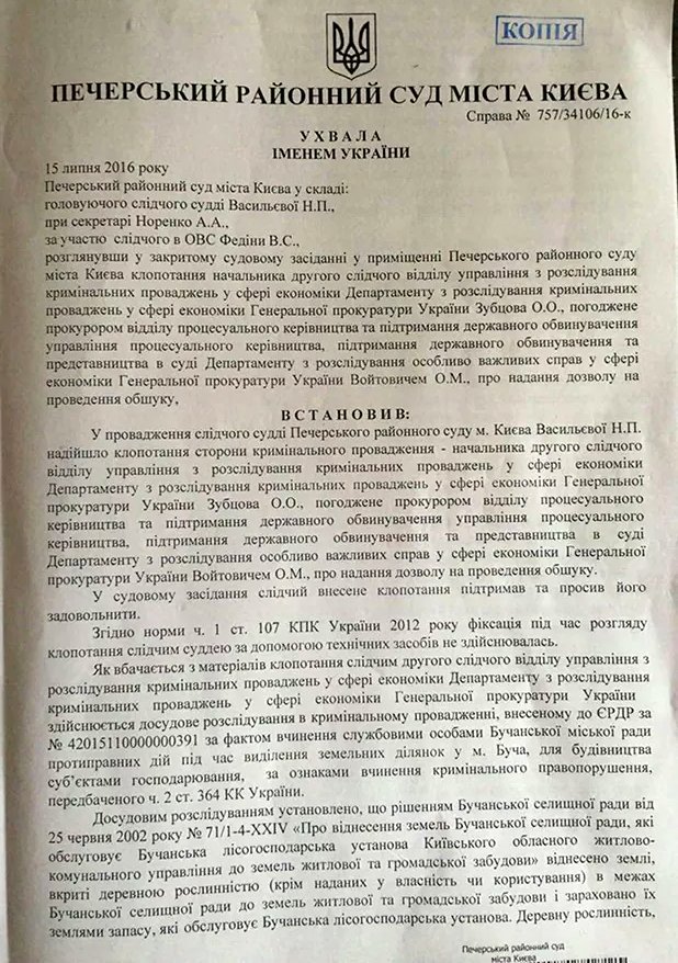 И хотя в то время обыски все ещё продолжались, начальник Департамента по расследованию особо важных дел в сфере экономики Генеральной прокуратуры Украины Владимир Гуцуляк уже отчитался об успешном ходе обысков: «обыски продуктивные и результативные - изъято большое количество документов, которые указывают, что эти земли изначально незаконно выводились, потом передавались подставным лицам, а потом с небольшим промежутком времени предоставлялась собственность в использование близким к должностным лицам Бучанского и Ирпенского горсоветов, которые дальше, с помощью своих строительных компаний, осуществляли жилую и общественную застройку».