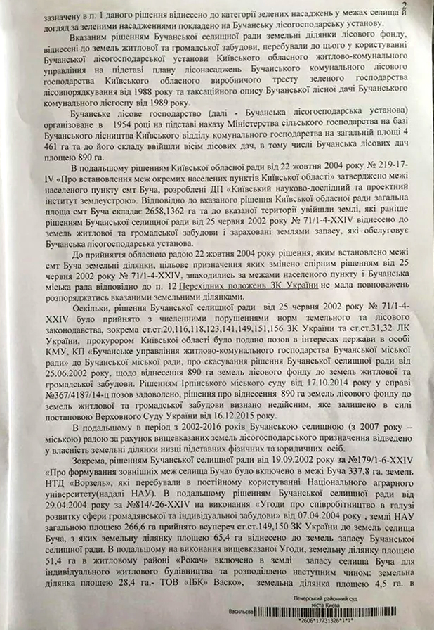 27 июля 2016 года горсовет подал заявление о пересмотре решения Ирпенского городского суда 2014 года, которым решение об изменении целевого назначения под жилую и общественную застройку 890 га леса в Буче поссовета признавалось незаконным. Еще в 2015 году это решение Верховный суд Украины оставил без изменений. Заседание по пересмотру возврата земель в госсобственность, которое должно было состояться в среду, 17 августа, перенесли на 26 сентября.
