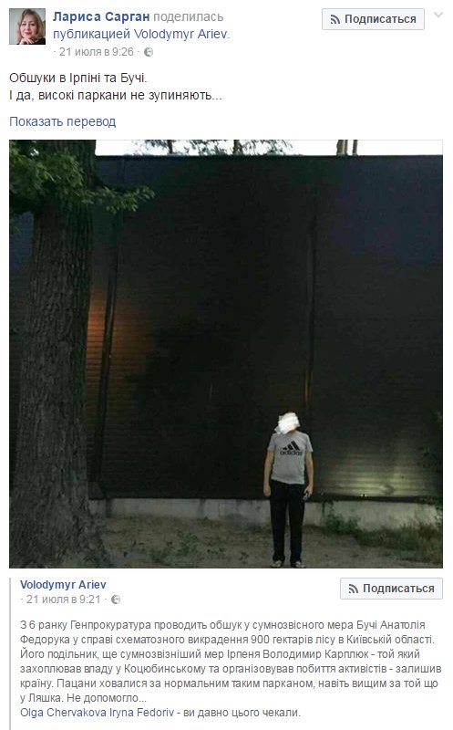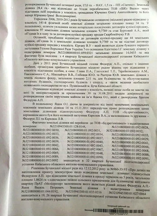 Тут и нашлось наконец объяснение: а что, собственно, происходит? Первой о деталях дела поведала общественности именно Червакова: «в 2002 году, когда Анатолий Федорук уже был мэром Бучи, местный совет незаконно изменил целевое назначение зеленых зон бывшей Бучанского лесной дачи. 890 гектаров леса первой категории бучанская власть раздерибанила под застройку. Прокуратура обратилась с иском, и в конце 2015-го года решением Верховного Суда Украины иск был удовлетворен, а земли возвращены государству. Речь идет о 890 га леса вокруг так называемого «Бучанского Межигорья» - имения экс-вице-спикера ВР, коммуниста Игоря Калетника. Решением суда лес площадью 14,0455 га также истребован в пользу государства из незаконного владения родственника Калетника. Однако, после вступления в законную силу вышеуказанных судебных решений, Бучанским городским советом были повторно приняты 7 решений о передаче в собственность земельных участков в лесу под застройку. Прокуратурой Киевской области повторно предъявлены 3 иска об их отмене и истребовании земельных участков в пользу государства. Обыски, которые сегодня происходят в Ирпене и Буче, проходят в рамках уголовного производства, возбужденного в августе 2015 года по факту злоупотребления служебным положением должностными лицами Бучанского городского совета при изъятии земель лесного фонда и изменения их целевого назначения общей площадью 890 га, с целью получения неправомерной выгоды в интересах другого физического или юридического лица вопреки интересам службы, повлекшее тяжкие последствия охраняемым законом правам, свободам и интересам государства. Расследование ведет Главное следственное управление Генеральной прокуратуры» (ч. 2 ст. 364 УК от 11 сентября 2015).