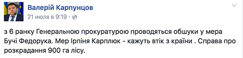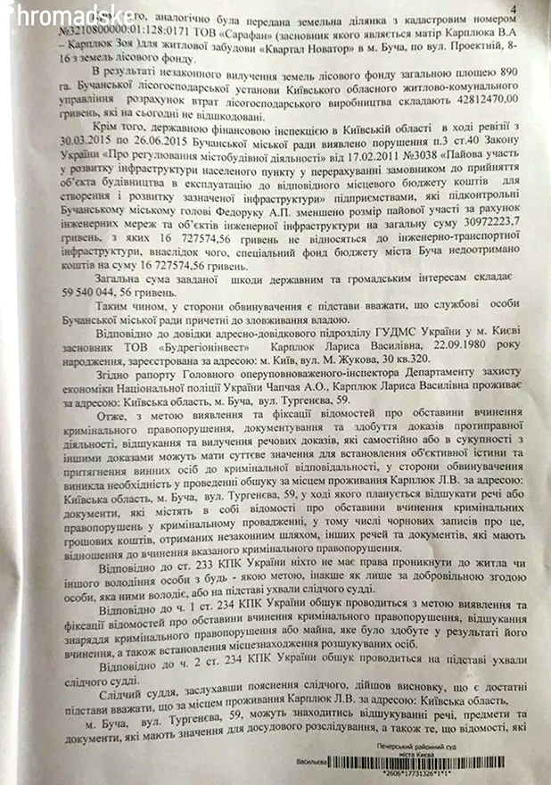 Утро 21 июля сего года для руководителей городов Буча и Ирпень Киевсой области - Анатолия Федорука и Владимира Карплюка - началось явно не по расписанию: в 6 утра к Федоруку нагрянули с обыском по месту жительства, Карплюк же к этому времени уже покинул страну; одновременно Департаментом по расследованию особо важных дел в сфере экономики Генеральной прокуратуры Украины и Департаментом противодействия преступлениям в сфере экономики Национальной полиции Украины и Главным управлением «К» Службы безопасности Украины проводились обыски по 31 адресу, в помещениях городских советов Ирпеня и Бучи, а также помещениях предприятий, изготавливающих техническую документацию по отводу земель.