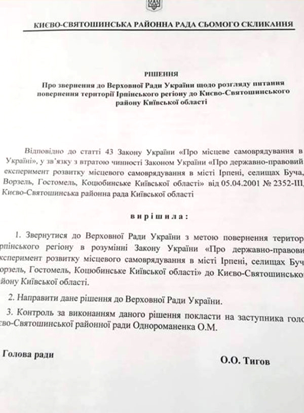 Парцхаладзе стало понятно, что ГПУ будет трудно пришить Карплюку дело. Также после митинга в поддержку мэров Бучи и Ирпеня под стенами ГПУ 23 июля официальный Киев увидел, что Карплюка реально поддерживает общество. И, очевидно, в погоне за гектарами Беличанского леса (Ирпень, Буча, Приирпенье - это гектары Беличанского леса) у Парцхаладзе созрел еще один план - присоединить Ирпень вместе с подчиненными ему территориями (Коцюбинское, Гостомель, Ворзель) в Киево-Святошинский район Киевской области. Киево-Святошинский районный совет даже подготовил соответствующий проект решения, который разместил у себя на странице в фейсбуке Владимир Карплюк, подписав : «начинают проявляться клерки от реальных заказчиков этого дела... Странно... Президент за децентрализацию. За увеличение полномочий органов местного самоуправления. За ликвидацию районов... А его партийцы так его подводят...». Это решение было подписано главой рады Александром Тиговым, являющимся фигурой, приближенной к Льву Парцхаладзе.