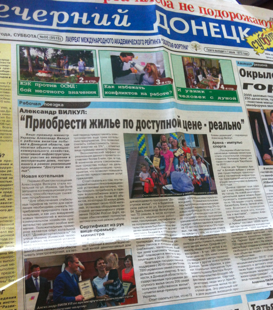Следующий пример «джинсы», но на другую тему - в газете «Вечерний Донецк» от 27 июля 2013 года № 86. На центральной полосе статья: «Александр Вилкул: «Приобрести жилье по доступной цене - реально».