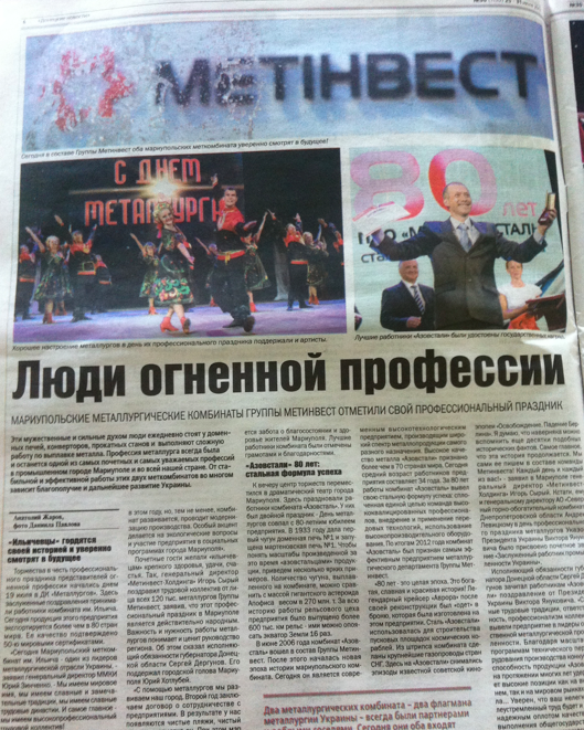 Например, в последнем выпуске газеты «Донецкие новости» от 25 июля 2013 года опубликована статья «Люди огненной профессии», которая рассказывает о том, что «мариупольские металлургические комбинаты группы «Метинвест» отметили свой профессиональный праздник».