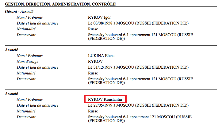 В реестре французских юрлиц без особых усилий находится фирма SCITRINITY M, принадлежащая Константину Рыкову и обоим его родителям.