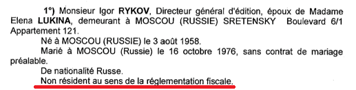 Особенно интересно то, что резиденты Франции платят налоги не только со своих французских доходов, а со всех вообще. Интересно было бы узнать, сколько предположительно кремлевских рублей Константин Рыков заплатил во французскую казну.
