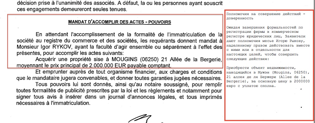 Действительно, в уставе фирмы сразу видно, что фирма уполномочивает мсье Игоря Рыкова приобрести объект недвижимости по адресу 21 Allée de la Begerie за 2 миллиона евро.