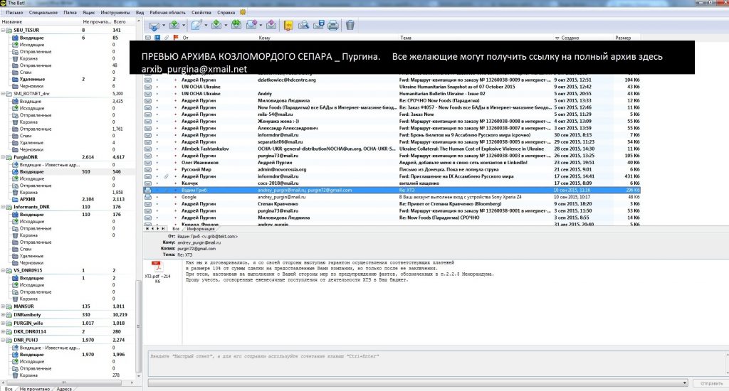 Хакеры слили в интернет архив электронной переписки бывшего спикера так называемого «Народного совета ДНР» Андрея Пургина. В нем содержится внутренняя документация «ДНР», к которой имеет доступ Пургин, банковские платежные поручения, служебные записки лидеров самопровозглашенной республики и оперативные данные с мест проведения военных действий.