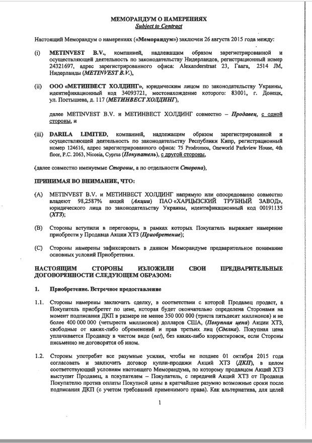 В архиве можно найти имена и контакты бизнес-партнеров «ДНР», а также информацию о сделках по продаже имущества и предприятий края. Например, в переписке содержится меморандум о намерениях относительно сделки купли-продажи Харцизского трубного завода за $350-400 млн.