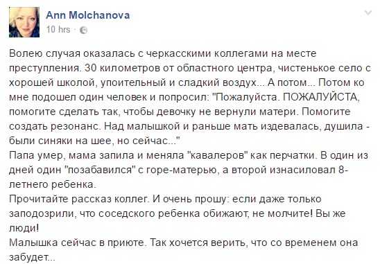 Місцеві жителі розповіли журналістам, що мати постійно знущалася над дочкою, била і душила її, займалася в її присутності сексом з чоловіками.