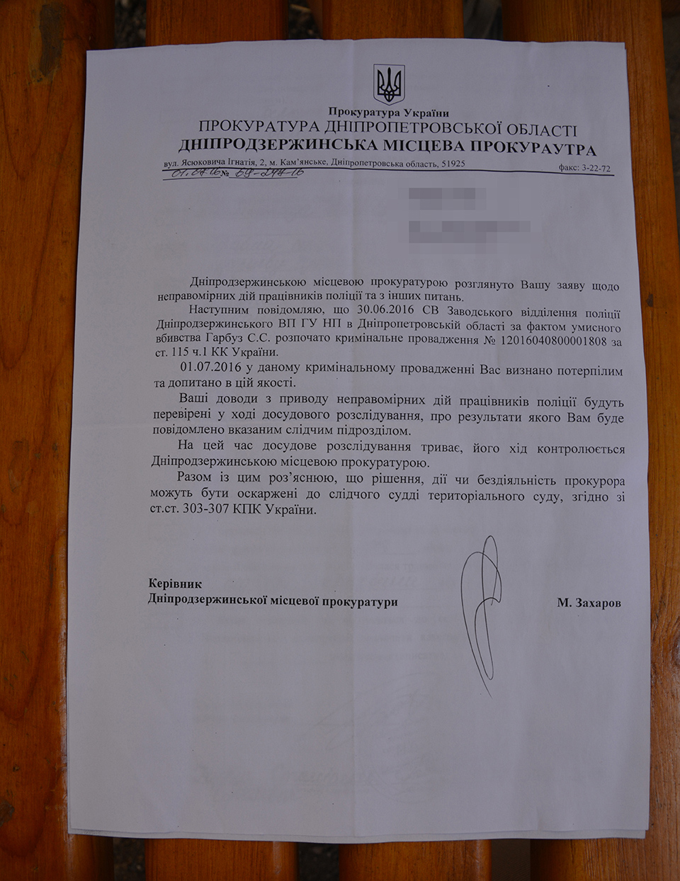 Два месяца назад, в ночь с 29 на 30 июня в Каменском возле дверей своей квартиры по улице Ковалевича, 2 на лестничной клетке был убит 30-летний Сергей Гарбуз. Убит, по показаниям его гражданской жены Юлии — единственной свидетельницы, проходившей не со стороны полиции — патрульными, приехавшими по вызову соседей на семейный скандал.