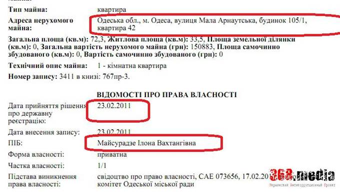Впрочем, не стоит думать, что семейство Белых ночует в собственных автомобилях. Как показали журналистские расследования, на супругу опального прокурора ИлонуМайсурадзе, помимо машины, еще с 2011 года оформлена квартира (72,3 м2) на улице М. Арнаутская, 105/1 в Одессе.