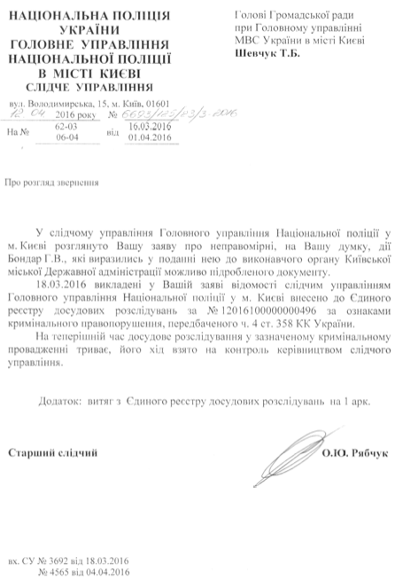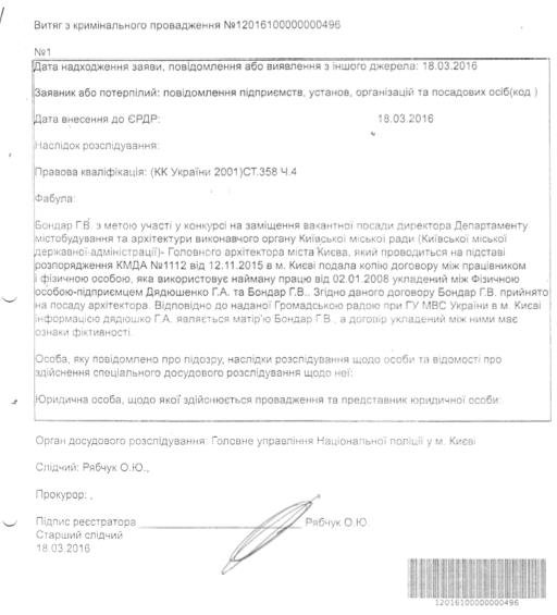 Собственно, вот документ, который повествует нам о фабуле криминального производства в отношении фальшивых документов госпожи Бондарь.