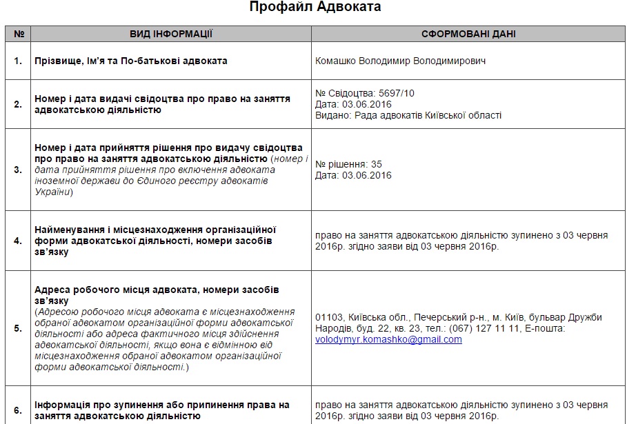 В частности, 3 июня 2016 года Комашко получил адвокатское свидетельство 5697/10 и принял присягу адвоката. Отметим, что сам надзорник в это время продолжал работать в главке на Резницкой - на должности начальнкиа управления надзора за соблюдением законов при исполнении судебных решений в уголовных производствах и других мерах принудительного характера ГПУ.
