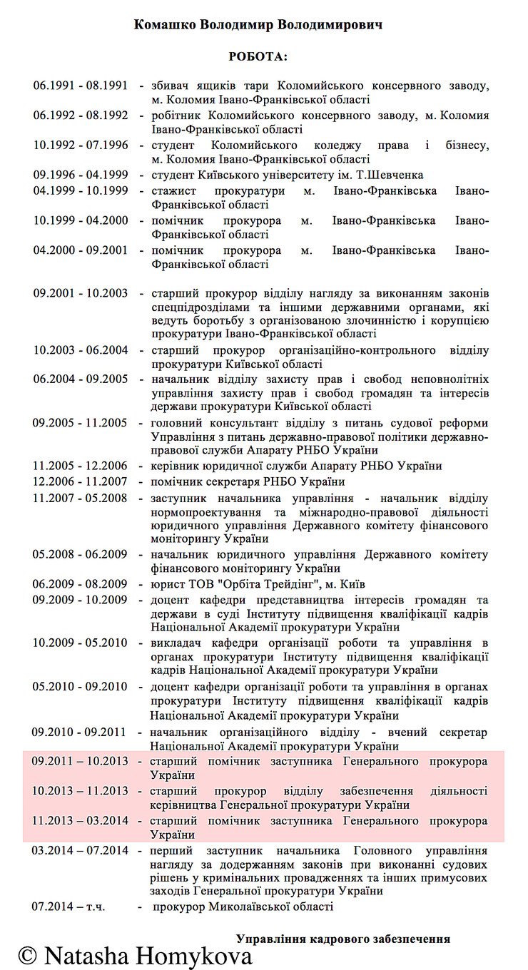 Отметим, что Комашко стал известен в СМИ в период его работы на посту прокурора Николаевской области (с середины 2014 по февраь 2015 года), когда журналисты раскопали тщательно скрываемую надзорником информацию о том, что он был очень близок к руководству ГПУ времен Виктора Пшонки. Естественно, что в угоду продолжению кадровому росту после Евромайдана надзорник всячески "вымарывал" свою близость к верхушке Резницкой в период акций протеста 2013-2014 годов, и даже подчистил официальную версию своей биографии.